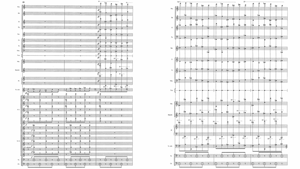 Il secondo movimento è una cadenza di quattro battute in pieno stile barocco, per struttura, scelta armonica (nella tonalità relativa minore rispetto a quella del primo movimento) e carattere intimo, grave, e che si aprirebbe alla fine per accogliere, in un contesto barocco, il classico finale scoppiettante, virtuoso. Pärt invece sceglie la via dell’ostinato ritmico, abbracciando solo a metà quest’ispirazione, e vi ritaglia intorno la stessa serie presentata nel primo movimento che ora si rivela lentamente nella parte del violoncello. È il momento della presa in giro, della pesantezza e dell’insistenza come elemento buffo, la caricatura di un certo modo di scrivere il dramma, l’insistenza, ma questo è ancora ignoto all’ascoltatore all’inizio del movimento (lungo circa tre minuti, come una canzone dei Beatles). Dopo una prima introduzione dell’ostinato e del suo accompagnamento percussivo – ora non più un’iniziativa fine a se stessa ma parte integrante del materiale musicale – Pärt ritaglia all’interno del collage alcuni motivi negli ottoni che ricordano, nello stile, Shostakovich e la sua maestosità, l’ostinazione. Questo mondo sonoro viene subito interrotto da colpi durissimi e rigorosi di tutta l’orchestra insieme al solista, risultando prima disperati e, già dal secondo intervento, quasi una stilizzazione dell’insistenza pedante, ancora una volta caricaturale – sembra di riuscire a vedere un direttore dirigere questo passaggio con lo stesso identico movimento per tutti gli accordi, o ancora un bambino che pesta i piedi per terra vigorosamente. Anche in partitura la notazione è rigorosissima e quasi iperbolica: ogni strumento è unito da una lunga linea che attraversa la partitura per accertarsi (in contrato con la libertà spaziale della battuta nel primo movimento) che tutti gli elementi coinvolti si muovano perfettamente insieme.